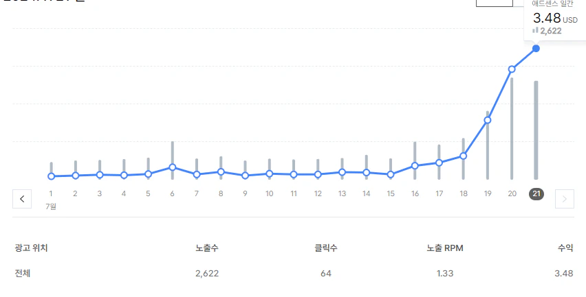 방문자 수가 5000명을 넘었지만 광고 노출이 2700회 정도밖에 되지 않아 의아했지만, 클릭 수가 64로 노출 RPM이 꽤 많이 상승했습니다. 일간 수익 중 가장 높은 금액을 받아본 순간이었습니다.
