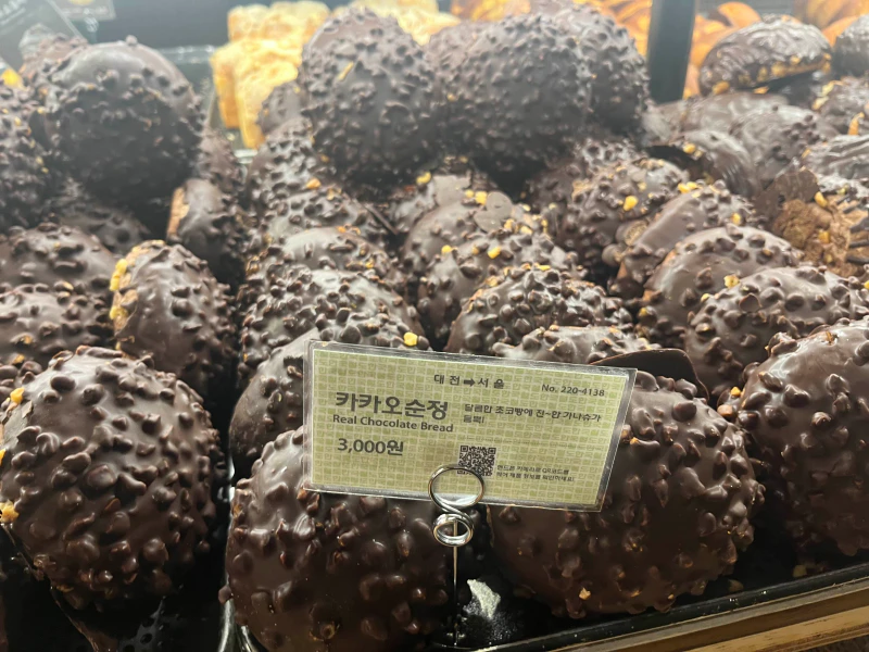 - 초코튀소: 초콜릿이 덮인 튀김 소보로로, 겉은 바삭하고 초콜릿이 진하며 안에는 달달한 팥이 들어 있습니다. 초콜릿과 팥의 조화가 잘 어울립니다. 성심당은 초코초코 한 빵이 많이 없는데, 카카오순정 말고 맛있게 달콤한 빵이에요.