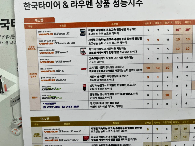저는 한국타이어 Ventus S2 AS 모델을 선택했어요. 금호 TA91과 항상 비교되는 모델이긴 한데, 최근 칩컷과 마모 이슈가 있어서 동급 라인에서는 S2 AS가 가장 합리적인 선택인 것 같았어요.