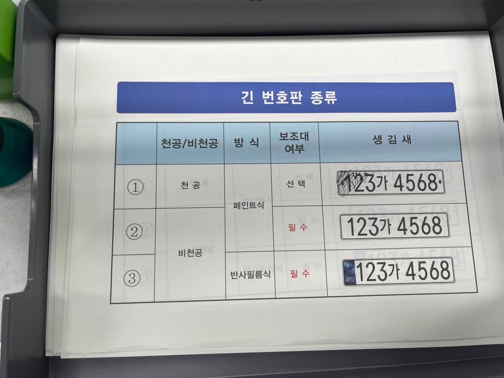 3번 반사필름식 비천공 번호판이 가장 깔끔하고 시인성도 좋다는 평이 많은데, 추가 비용이 발생한다. 대략 3만~5만원 정도 더 든다고 보면 된다. 나는 경차라 비용을 아끼고 싶어서 2번 비천공 페인트식으로 선택했다.