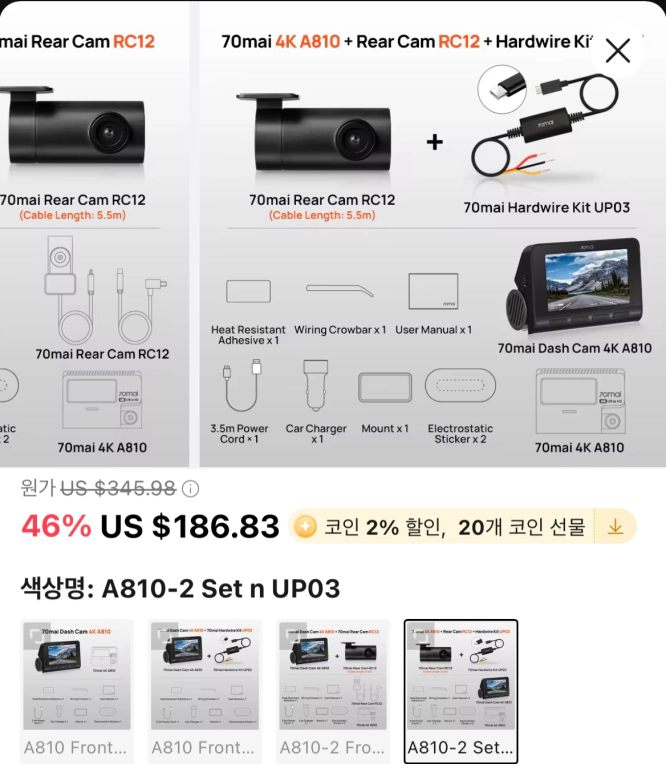 - A810:위에 말한 후덜덜한 스펙에, 가격은 A810 전후방 세트 기준 약 179달러(약 24만원) 수준이라 국내 유명 브랜드의 절반 가격이면서도 스펙은 오히려 더 좋은 느낌.