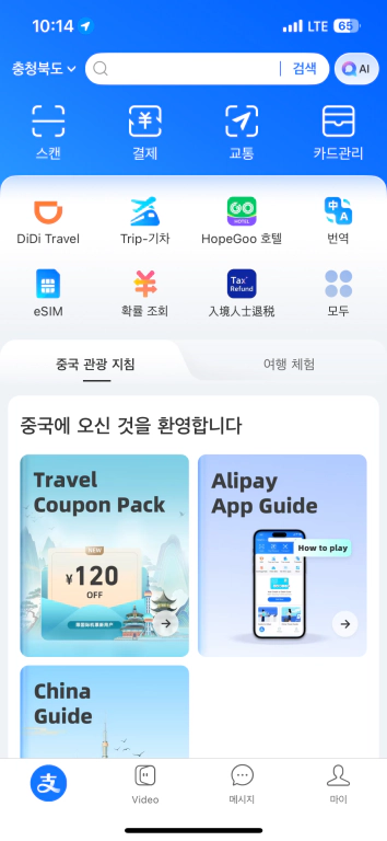 한국어 설정까지 끝났다면 마지막으로 결제 수단을 등록해야 한다. 신용카드나 체크카드를 연결해두면 중국 현지에서 바로 결제할 수 있다. 실제로 중국에 가서 편의점, 식당, 택시 등 거의 모든 곳에서 알리페이를 썼는데 정말 편했다. 현금 환전할 필요도 없고, QR코드만 찍으면 결제가 끝났고, 따로 신분인증은 하지 않았다. (신분 정보 업로드 즉, 여권등록은 현지에서 대중교통을 탈 때 필요했다)