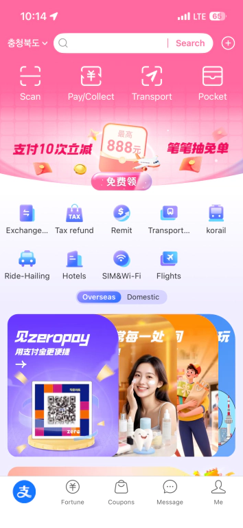 알리페이를 한국에서 미리 설치하고 중국 여행을 준비했다. 가기 전에 앱을 열어보니 분홍색 배경의 화면이 나왔는데 (띠용..), 메뉴도 전부 중국어였다. 이 상태에서는 결제 기능도 제대로 사용하기 어려워 보였고, 뭔가 제한적인 느낌이 강했다.
